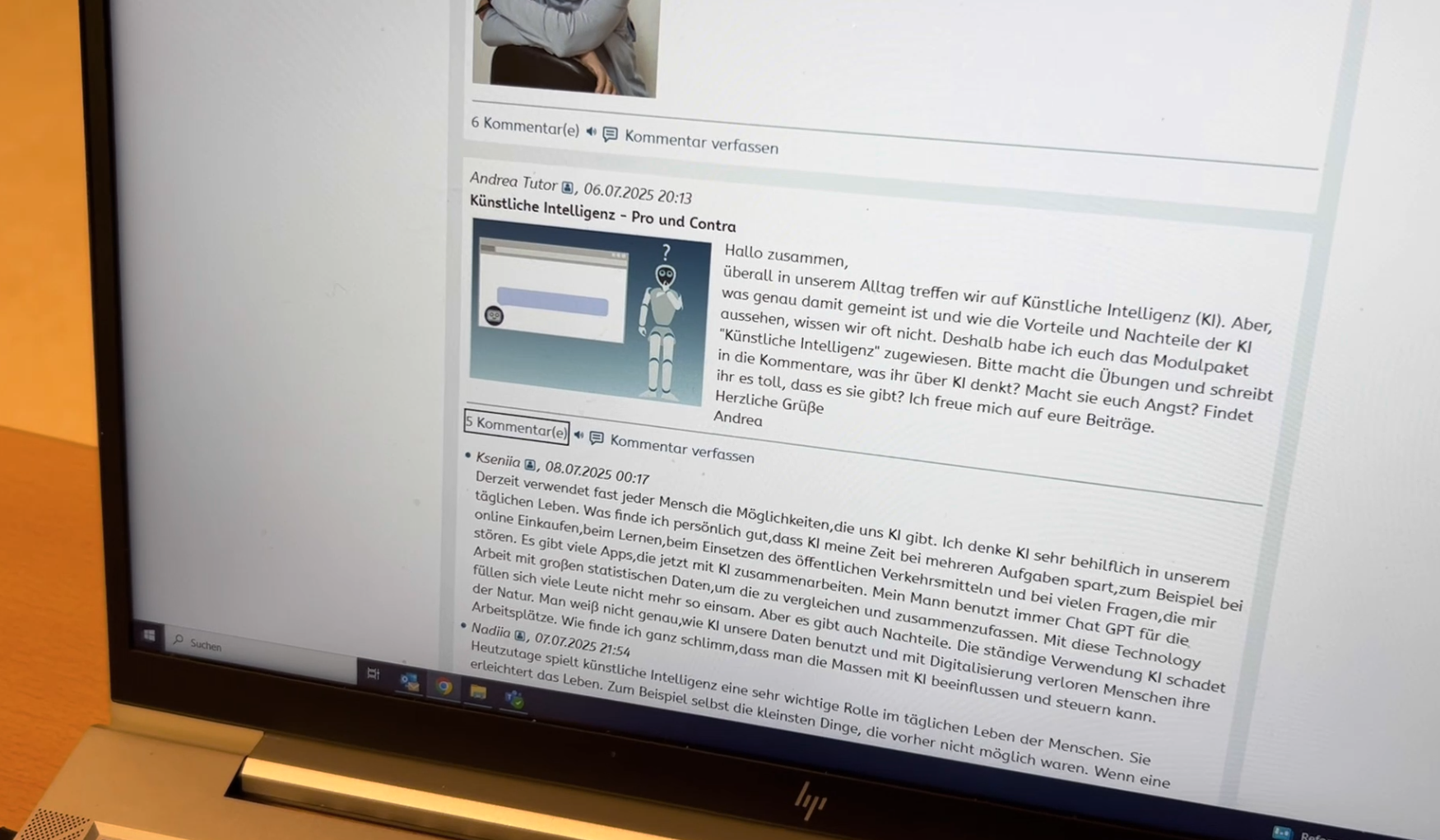 Danach bearbeiteten die Teilnehmenden einen Artikel aus der Süddeutschen Zeitung, der Vor- und Nachteile von KI gegenüberstellt. Nach der inhaltlichen und sprachlichen Vorbereitung sollten sie ihre eigene Meinung zu KI in kurzen Texten auf der virtuellen Pinnwand im vhs-Lernportal posten.