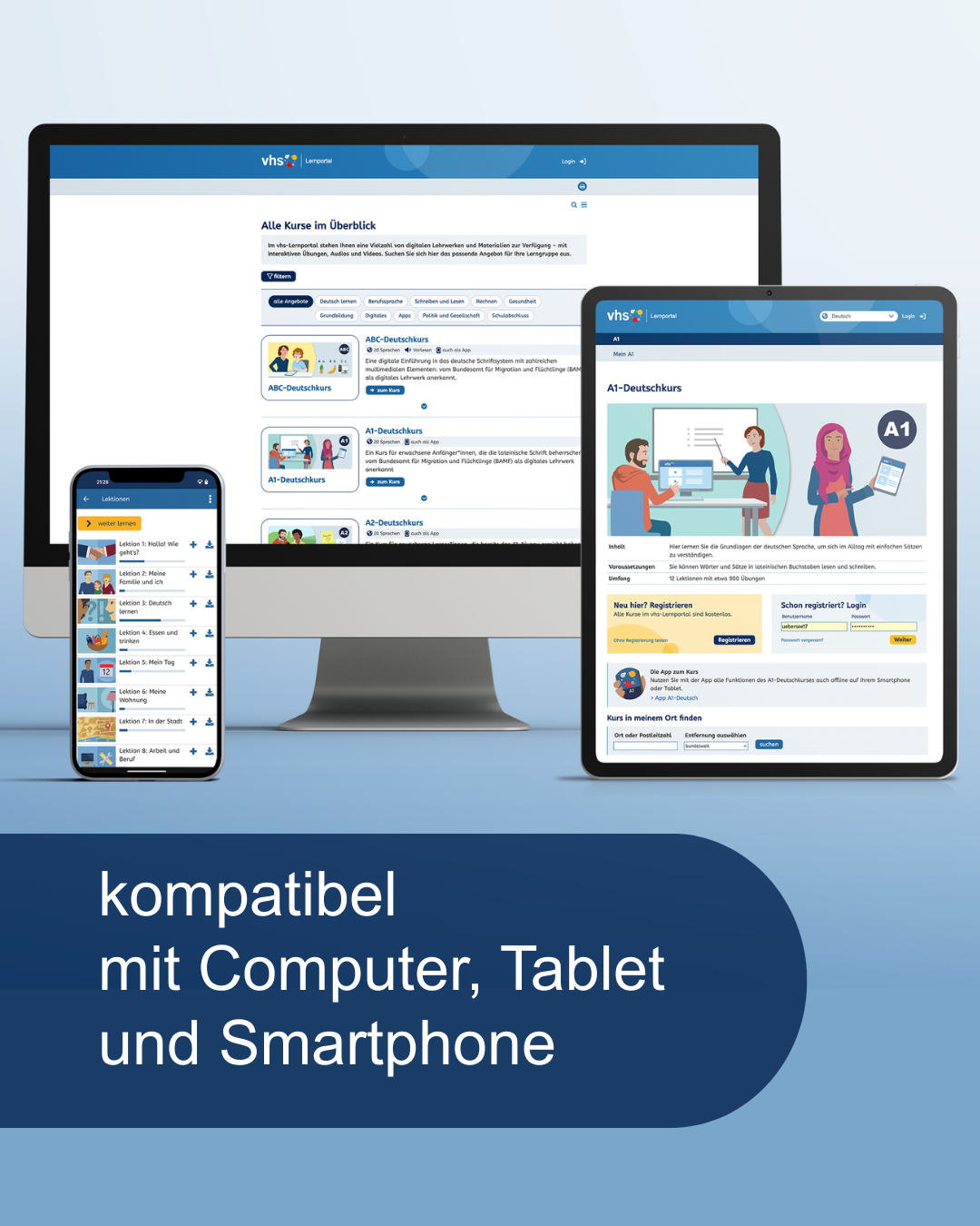 Hier können finden Sie ausführliche Infoblätter zu den einzelnen Kursen sowie eine Broschüre zum Deutschlernen mit dem vhs-Lernportal. Die Inhalte richten sich an Lehrkräfte und Mitarbeitende in Bildungsinstitutionen. Sie können die PDFs per E-Mail weitergeben oder drucken (lassen).